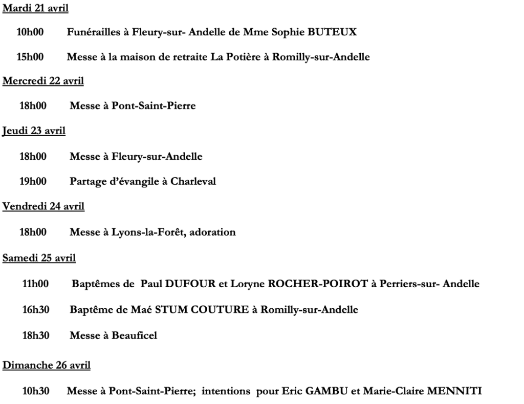 - Vendredi 18h à Lyons-la-Forêt (suivie d’un temps d’adoration et de confession pour ceux qui le souhaitent)